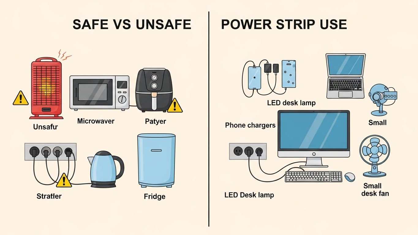 The bottom line? Power strips are convenient for low-power devices like computers and lamps. High-wattage appliances that heat, cool, or have motors need direct wall outlet connections — no exceptions.